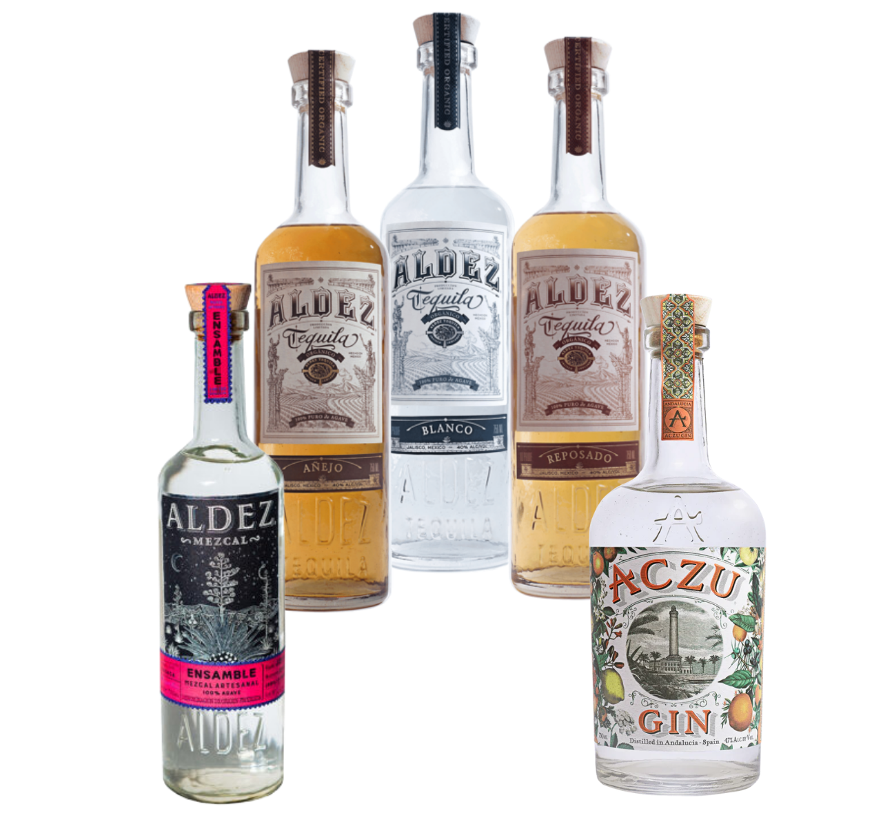 At Drink Good Spirits, our passion is producing spirits that are thoughtfully made from soil to seal. From advocating sustainable farming practices to selecting small, family-owned suppliers to create our eco-friendly packaging, our line of spirits strives to put the planet above profits. We want to do good so we can drink good spirits. Learn More...Bundle Includes 5 full-sized bottles (750ML): Aldez Mezcal Ensamble, Aldez Tequila Blanco, Aldez Tequila Reposado, Aldez Tequila Añejo, and Aczu Gin